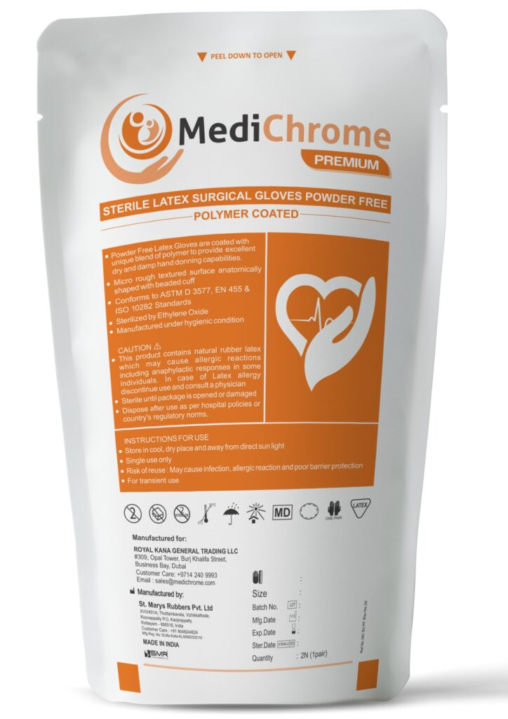 Sterile gloves for single use only. Sterile until package is opened or damaged Anatomically shaped with micro rough surface in palm and finger area Powder Free Surgical gloves are coated with a unique blend of polymer to provide excellent dry and damp hand donning capabilities Latex protein content less than 200g/ dm2 Powder content less than 2 mg/glove The Sterility Assurance Level (SAL) is 10-6 Biologically compatible as per ISO 10993-Part 5,7,10 & 11 Size of the gloves is embossed on the palm area Manufactured in a clean environment to achieve low bioburden level prior to sterilisation Sterilized by ETO / Gamma sterilization as per customer requirements.